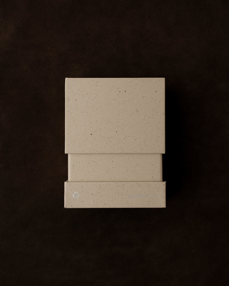 Folded into our drawer shape, they give each box a slower, more satisfying slide and a calm, matte presence that feels at home on a bedside table or desk. It’s still packaging, but it’s also a small object in its own right, something you can live with, reuse, and feel quietly good about every time you reach for what’s inside.