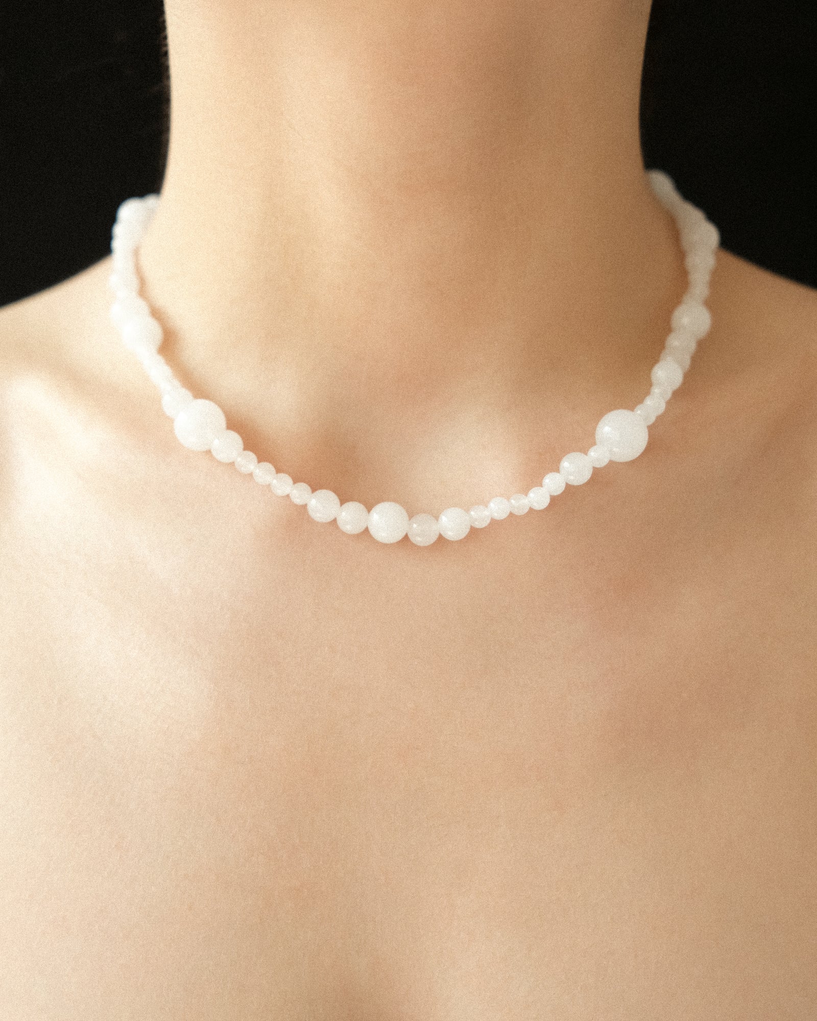 The Zhī Collection was created in celebration of our 8th anniversary. White Quartzite Jade, chosen for its iconic purity, reflects the timeless white that has been with us since the very beginning. Inspired by eastern elegance, the collection carries design like soft tassels and larger beads, an echo of grace in motion. The stone, a long-time favorite of our customers, holds a natural coolness and calm, aligning effortlessly with our brand’s spirit. Cascading beads flow like a quiet dance, marking this milestone with subtle joy. Meant to rest upon the collar, the piece pairs seamlessly with a minimalist and raw aesthetic, a quiet tribute to where we have been and where we are going.