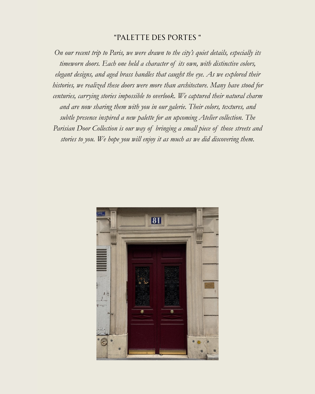 Palette des Portes is our first Atelier collection built entirely from a single place. Every colour, every form, every detail on these pieces can be traced to a specific door, on a specific street, in a specific arrondissement.