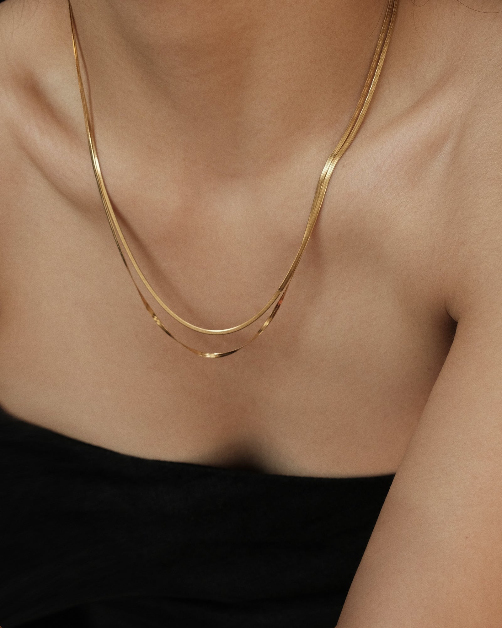 The thinnest chain in the Louella family now with double layered. It makes a subtle statement on its own or makes it a base for all your delicate layers.