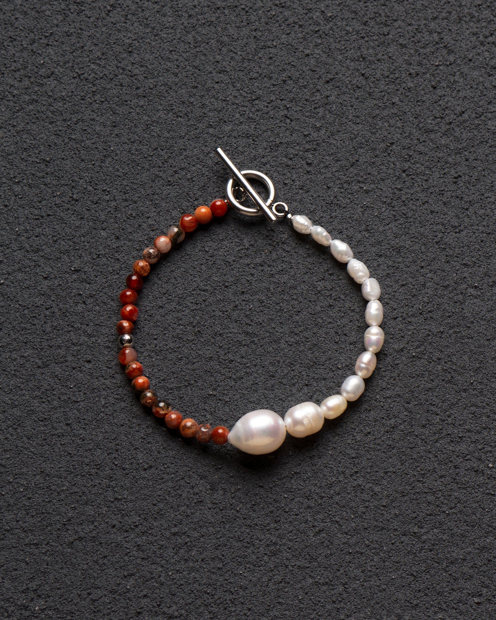 Rava brings together the raw beauty of red moss agate with the soft luster of freshwater pearls. Earthy and elegant, the contrast between fire-toned stones and organic pearls creates a striking balance. Red moss agate is said to inspire courage and emotional strength, grounding the wearer with quiet confidence.