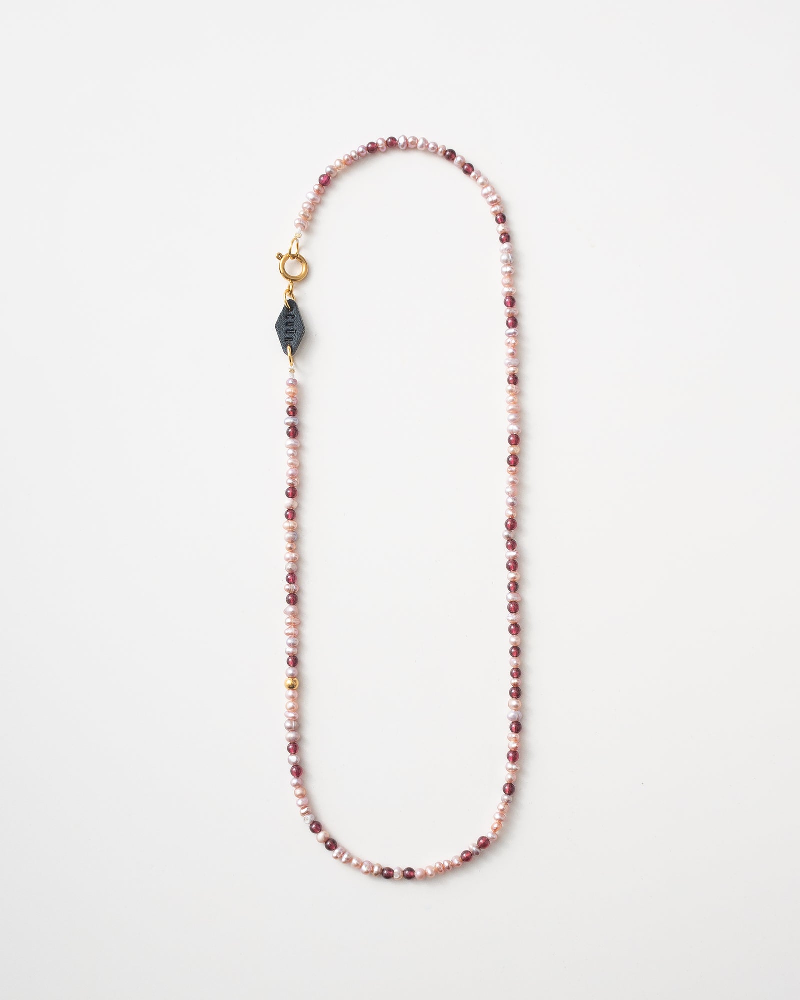 - Material: Cultured fresh-water pearl, Garnet and CUÜN custom leather tag