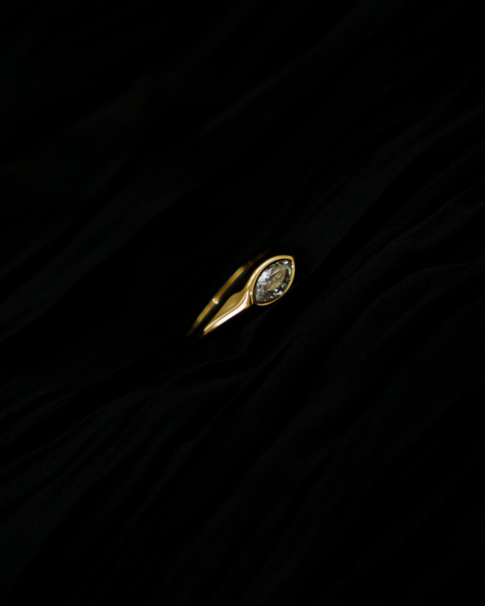 A luxurious, modern piece, inspired by ancient jewelry motifs. This ring is designed around the individual beauty of the diamond — a singular, monumental form, framed with a detailed sense of proportion.
